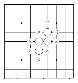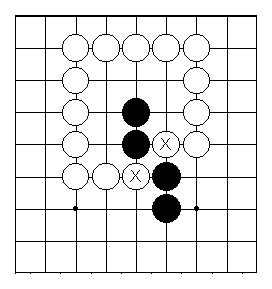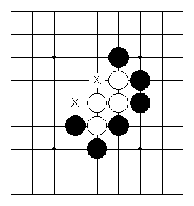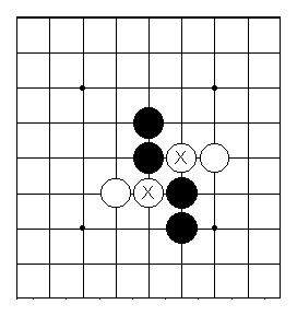 Diagramme 5: Les quatre pierres blanches forment une chaîne. Cette chaîne a deux libertés car Noir doit jouer deux coups en x pour la capturer.