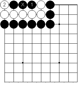Noir 1 fait atari. Blanc 2 capture trois pierres. Noir 3 doit être joué en x pour empêcher Blanc d’avoir deux yeux et la suite est facile.